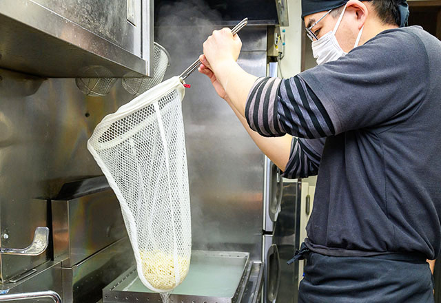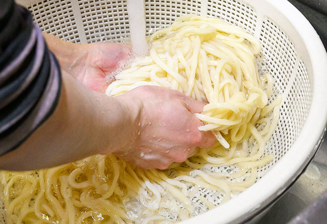 店内で製麺し、注文を受けてからゆで上げる自家製麺は、しっかりとしたコシがありながら、もっちりとした食感が特長。昆布や煮干し、かつおを取り合わせて引いた関西風の澄んだだしと見事に調和しています。