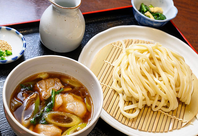 さらに、多摩のうどん文化を代表するひと品ともいえる「つけ汁肉うどん」も外せません。熱々のつけ汁には、豚肉と長ネギに加えて春菊が入り、その香りが味わいを一層引き立てます。