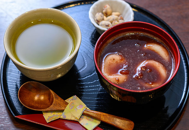 食後のデザートには「豆腐白玉ぜんざい」をいただきました。たっぷりの小豆と甘さ控えめのやさしい味わいに、心がほどけるようなひとときを過ごせます。