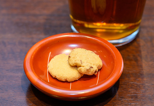 「多摩うどん ぽんぽこ」を運営する「社会福祉法人 時の会」は、就労継続支援B型や生活介護施設の運営といった福祉事業を行い、製菓事業として「ぐりーんぴーす工房」も展開しています。そのため、「多摩うどん ぽんぽこ」ではお通しとして「ぐりーんぴーす工房」のクッキーが提供されます。