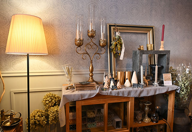 店内には、さまざまな色や形、大きさのキャンドルや関連アイテムが並んでいます。クラシックな雰囲気と上品さが同居する空間で、内装のほとんどは丹さんと友人たちによるDIYで作られています。