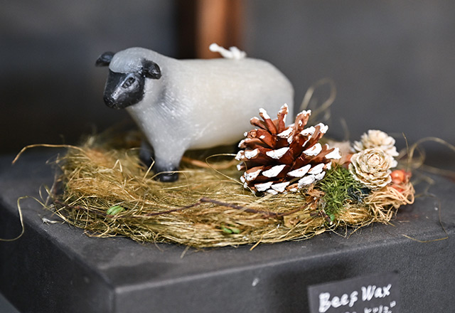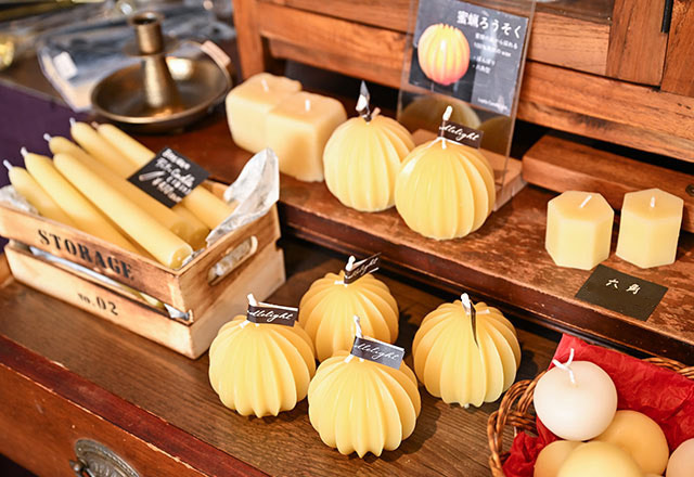 - ・100%天然由来の蜜ろうのキャンドルを中心に、パラフィンやソイワックスなど多様な素材を用いた作品が並ぶ
