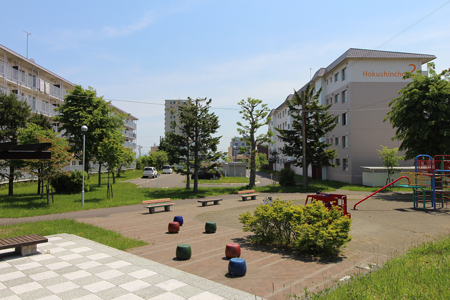「北広島北進町」はひろびろとした敷地に全9棟からなる団地で、敷地内には駐車場が200台以上、公園も複数あり、また住棟間の間隔も広く取られているため、日当たりや風通しが良好です。