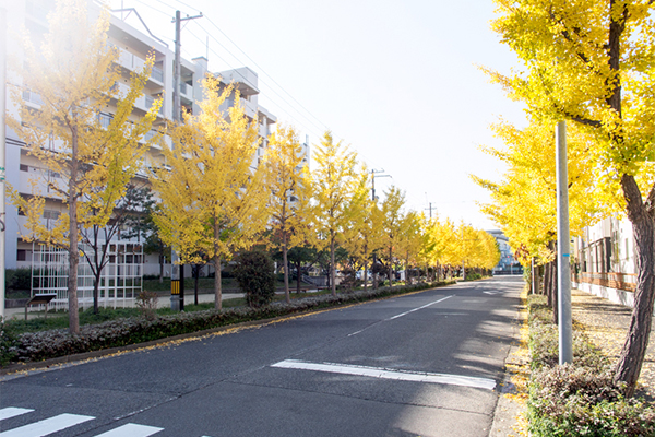 団地と団地の間を貫く道路沿いは見事なイチョウ並木が続いていて、秋は黄金の並木道となり、楽しませてくれます。