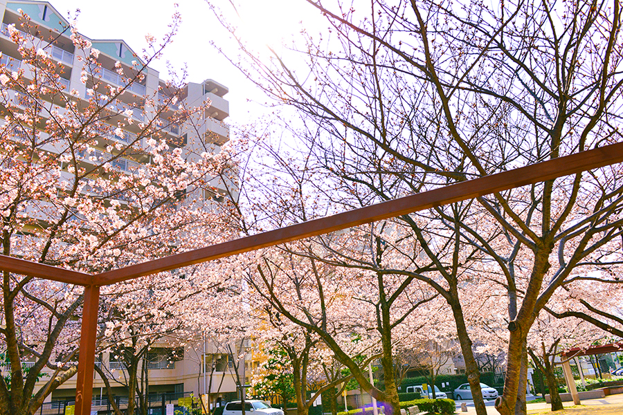 「サンヴァリエ金岡」は建物と建物の間隔が広めで、ゆとりある敷地となっています。木々も豊富でほっとする場。「スターハウスメモリアル広場」の近くには、桜並木が続いているので、満開の時期はお花見をする住民たちでにぎわいます。また、春は桜、秋は落ち葉拾いにと、近くの保育園の子どもたちの散歩コースにもなっています。