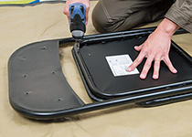 最後に、座面の裏に収納用のカゴを取り付ける。出し入れする側が正面にくるよう、取り付けの向きに注意。