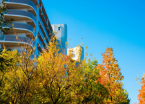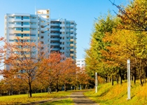 多くの自然が団地の四季を彩る「多摩ニュータウン ファインヒルいなぎ 長峰・杜の一番街」。秋になると葉を赤く色づかせる「モミジバフウ」が、深まる季節の訪れを知らせてくれます。白い住棟に映える紅葉、散歩道沿いに並ぶ秋色の木々、舞い散る葉たちが見せてくれる美しいシーン。ここには、そんな秋の景色がいたるところにあふれ、自然を身近に感じて暮らせるぜいたくな空間があります。