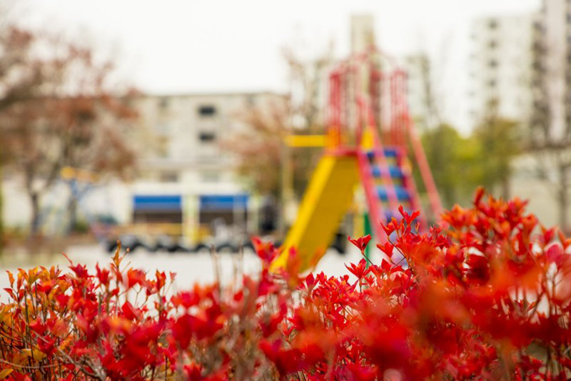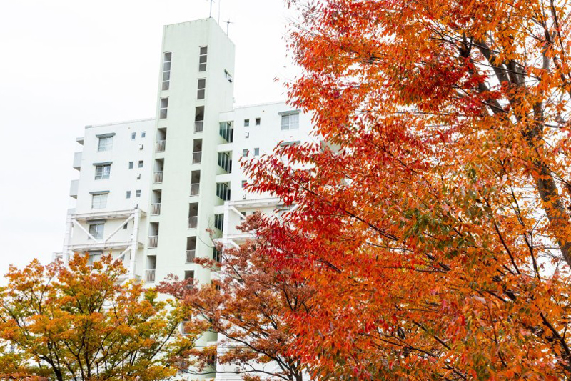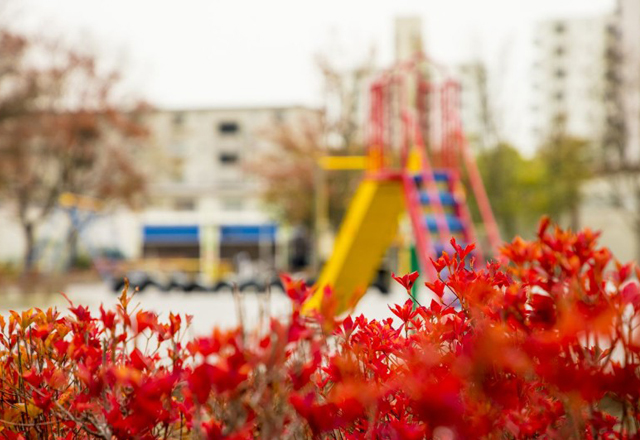 まるで森の中にいるような雰囲気の「多摩ニュータウン 永山」。広い敷地内には自然があふれ、団地全体が穏やかな心地良さに包まれます。木々に囲まれ、秋色に染まった景色が広がる敷地内。そんな秋景色の中で目を引くのは、鮮やかな赤の紅葉を見せてくれる「ドウダンツツジ」です。そのまわりは、ひときわ華やかな優美さが漂い、黄色の木々の葉とのコントラストが、見る人の心を明るく和ませてくれます。