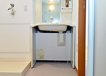 - 洗面化粧台の下に空間があり、ペットのトイレを置く場所として利用可能。脱臭機のためのコンセントも備え付けられています。
