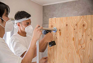 まずは、ユージさんが長押(なげし・壁面にある化粧部材)より上に、壁紙を貼る。「左端と上を合わせて、はくり紙をはがしながら貼っていくよ~!」