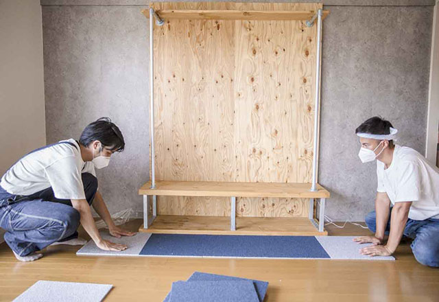 タイルカーペットは、裏の透明フィルムをはがして置くだけで吸着するタイプ。位置を決めてどんどん敷き詰めていく。