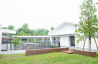 外壁を白く塗り直し、木目調の「小枝手すり」を設置。手すりは、やさしさの中にも洗練さが感じられ、シンプルな建物のアクセントに。広場の緑や設備とも調和して、広場空間を明るく一体感ある景色にしていました。