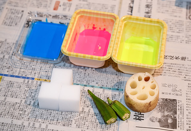 十数分後、乾いた手ぬぐいを手に「シェアベース洋光台」へ戻ると、机にはレンコンやオクラといった野菜とカラフルな布用インクがずらり。子どもたちはもちろん、大人も熱中して手ぬぐいに野菜スタンプを押し、オリジナル手ぬぐいを完成させました。