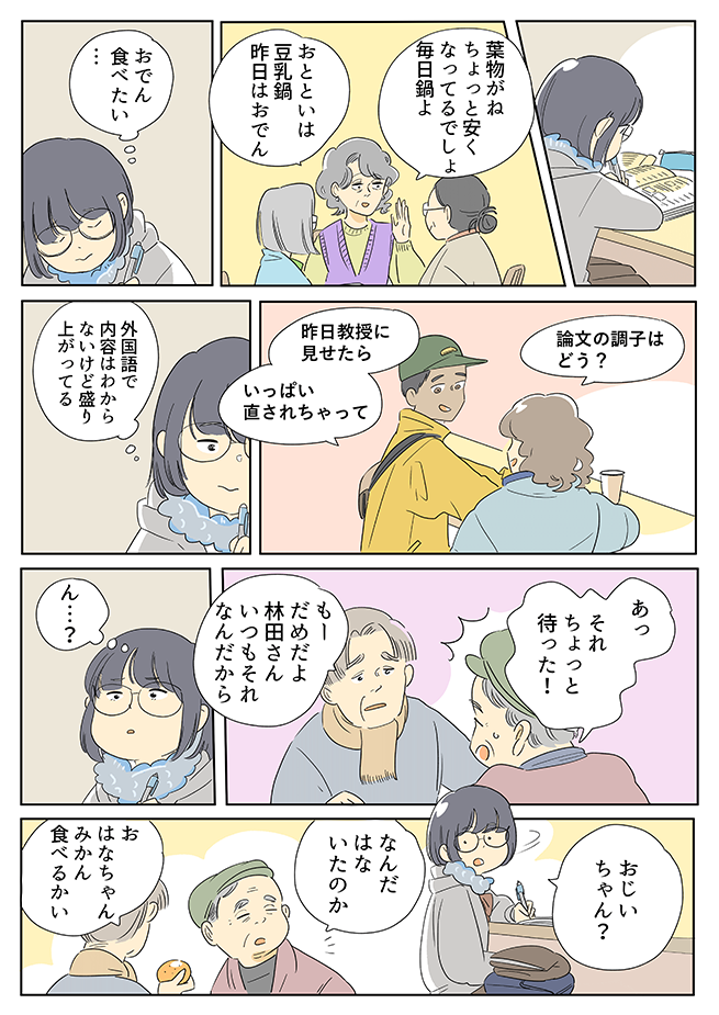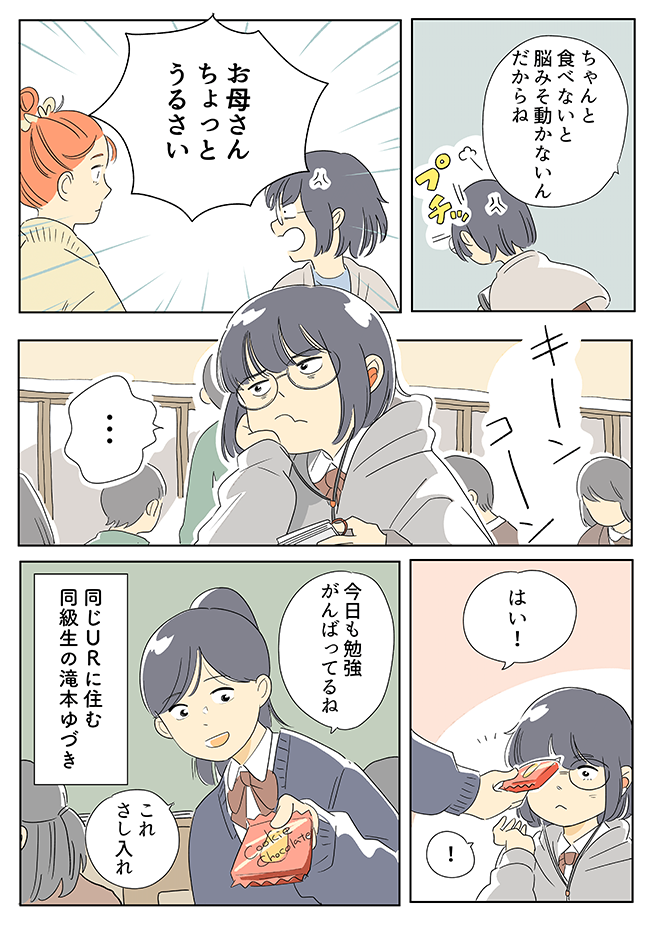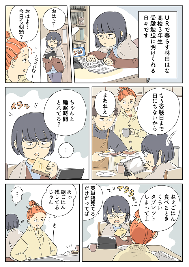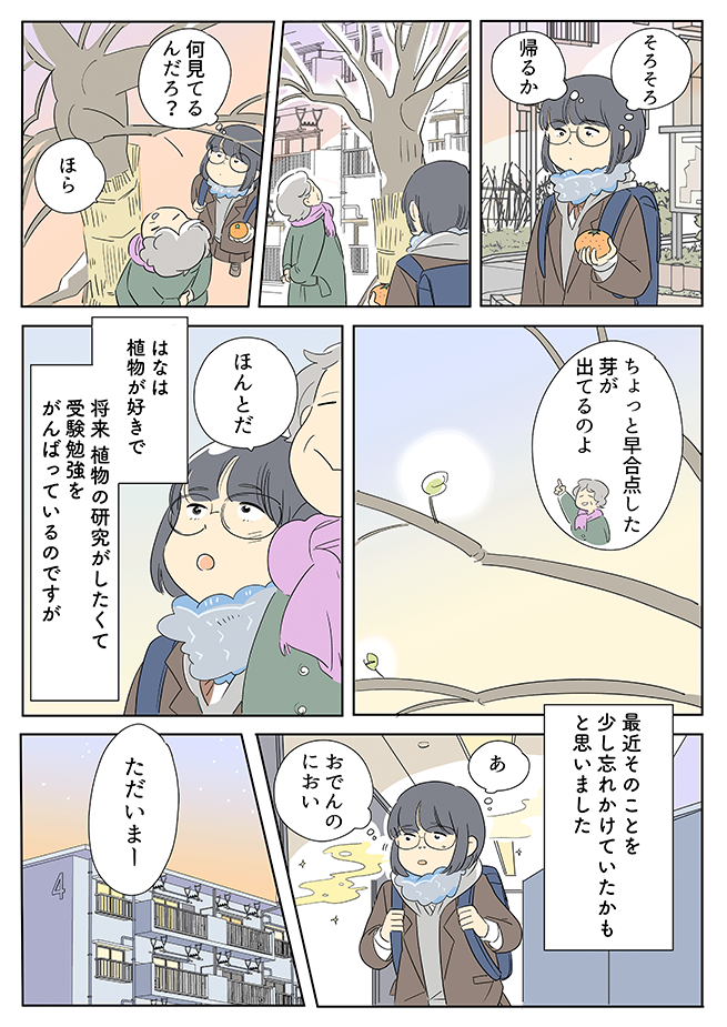 URで暮らす林田はなは、高3の受験生。美容師の母・くみは、娘を思うあまり口出しが増え、二人は衝突してしまいます。もやもやしながらも、ご近所さんと話したり、敷地内の自然に春を感じたりするうちに、少しずつ心が晴れていくはなとくみ。温かいおでんが、二人の気持ちを近づけてくれました。