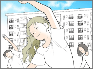 腹筋をしたら、勢い余って腰が「グキィ」。ストレッチもせず、いきなり筋トレを始め、腰を痛めたジョー太郎。そんな姿を見て、サチはUR団地の広場で開催されるあるイベントを思い出しました。それは「青空ヨガ」。そこには新たなる体験が待っていました。