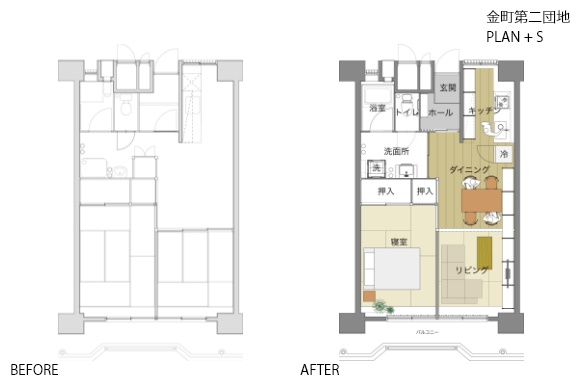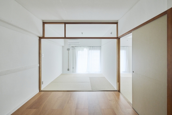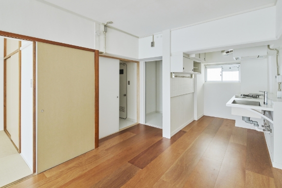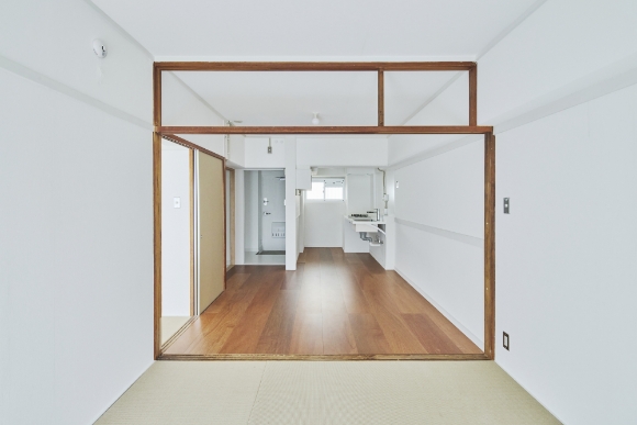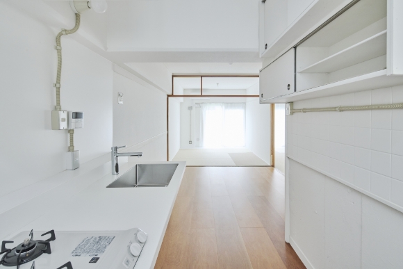 暗くなりがちだった玄関ホールを「半透明ふすま」で仕切ることにより明るい玄関ホールとし、洗面脱衣室も同様に「半透明ふすま」に変えることで独立した洗面脱衣室としました。また、和室とDKの間のふすまを撤去することで、南面から光と風が通り抜ける空間としました。また、キッチンの向きを変えることで冷蔵庫置き場を確保し、既存の吊り戸棚もそのまま生かしました。