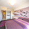 リビングから続くご夫婦の寝室はライラックカラーで統一。壁面には花柄のデコステッカーを添えてより印象的に。大人の雰囲気の中、ベビーベッドの天蓋をつけると、たちまち可愛い空間の出来上がり。娘さんのお部屋はピンク一色にし、こだわりのアイテムをチョイスしました。