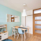ブルーのアクセントクロスが明るく爽やか。その壁は前面がネジや釘が打てる壁になっている為、テレビ台や収納、大きい鏡も安心して取り付けできます。間口に対して長さのあるリビングダイニングは、圧迫感の無い間仕切り収納を配置し、更にハンギングでグリーンを取り入れました。北欧の人々の知恵を借りて、室内の生活にうまく自然を調和させ、屋内の暮らしも楽しみます。
