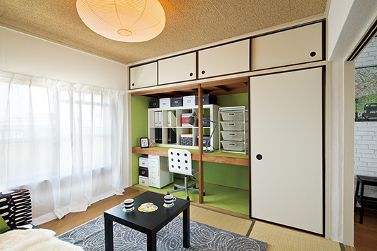 押入れの襖の一部、ダイニングとの仕切りの襖を取り外し天袋に収納。押入れ内にもアクセントクロスを貼り付け、押入れを利用した作業・収納空間をご提案。キッチン・リビング・ダイニングを一体的に広々と利用し、小物で差し色を使うことによりポップな印象もプラスされました。