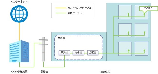 CATV事業者がCATV放送局から住棟までの既設のテレビ配線を利用して、インターネットサービスを実施している建物で、住宅内のテレビ端子にケーブルモデムなどの装置を設置することにより、インターネットサービスが利用できます。住棟内LAN方式 通信事業者一覧