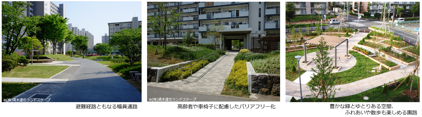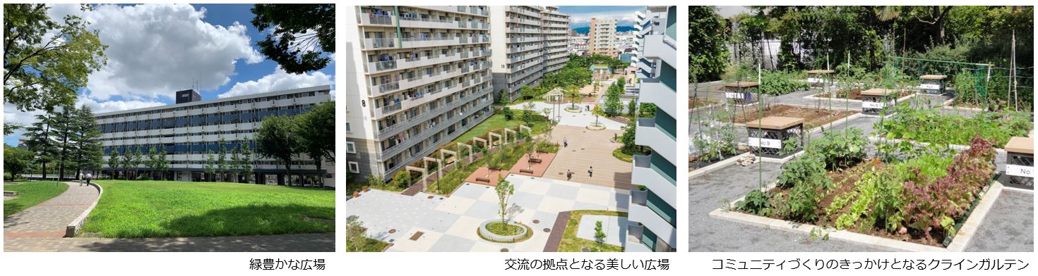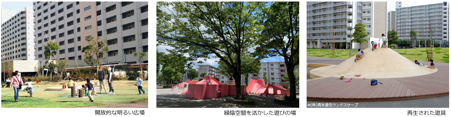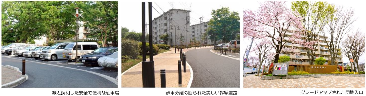 社会環境や周辺環境の変化に伴い、住まい手のライフスタイルやニーズも多様化してきています。団地の屋外環境においても、これらの変化に応えるため、人にやさしい、より安全で快適な住環境への再生を目指して、リニューアルを推し進めています。また、魅力ある屋外環境及び多様な世代が安心して住み続けられる環境の提供を目指し、「団地景観の向上」、「生活サービスの向上」、「コミュニティ形成への寄与」の観点から屋外環境の整備を行っています。