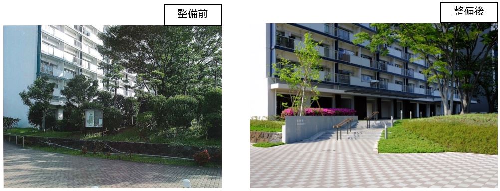 例2 周辺開発(社会環境変化)に伴い、団地の入口動線が変化したため再整備を実施