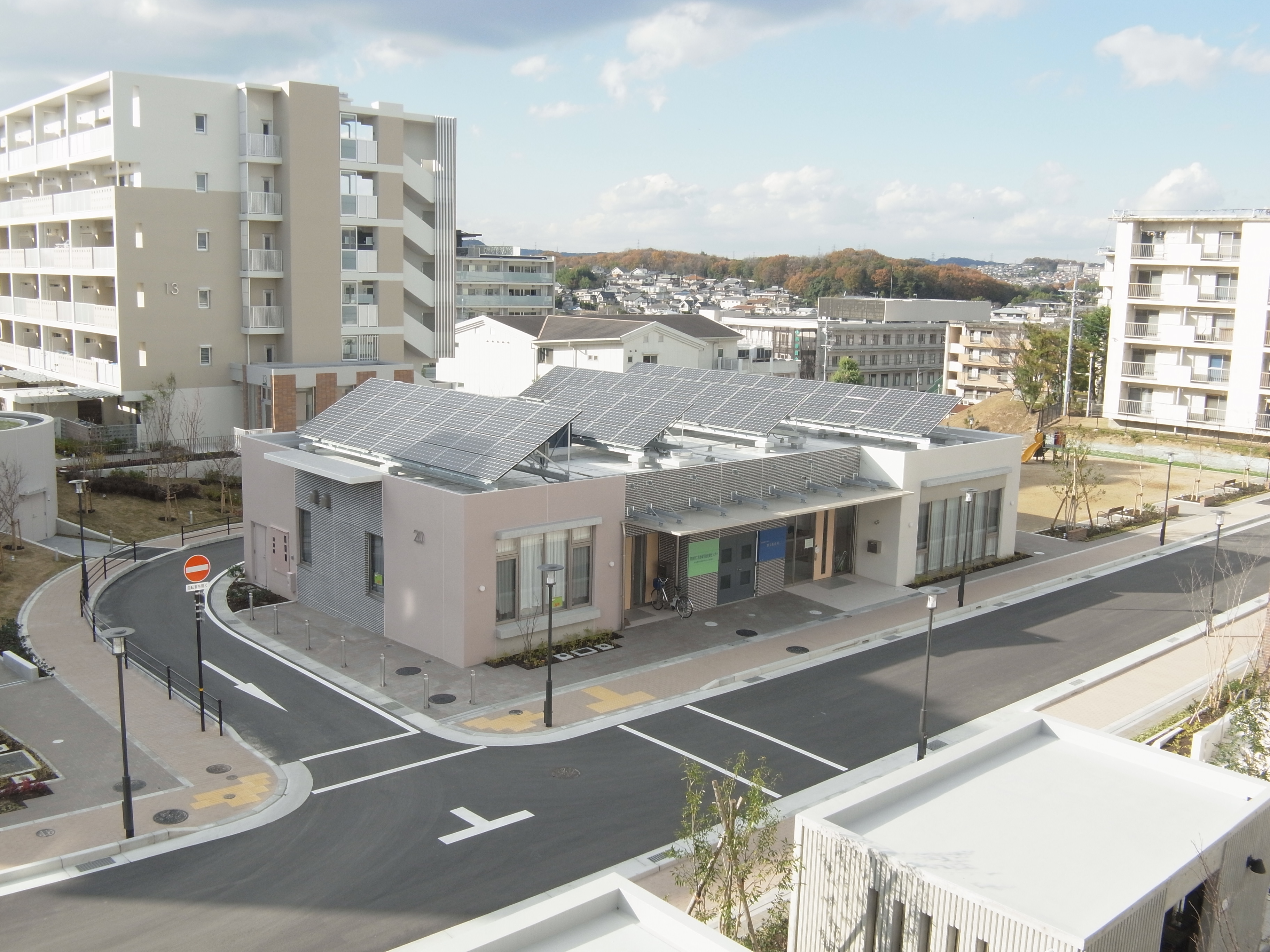 高齢者住宅に訪問看護や調剤薬局、保育所、学童保育等が併設されています。団地の中心にあり多世代交流の拠点にもなっています。