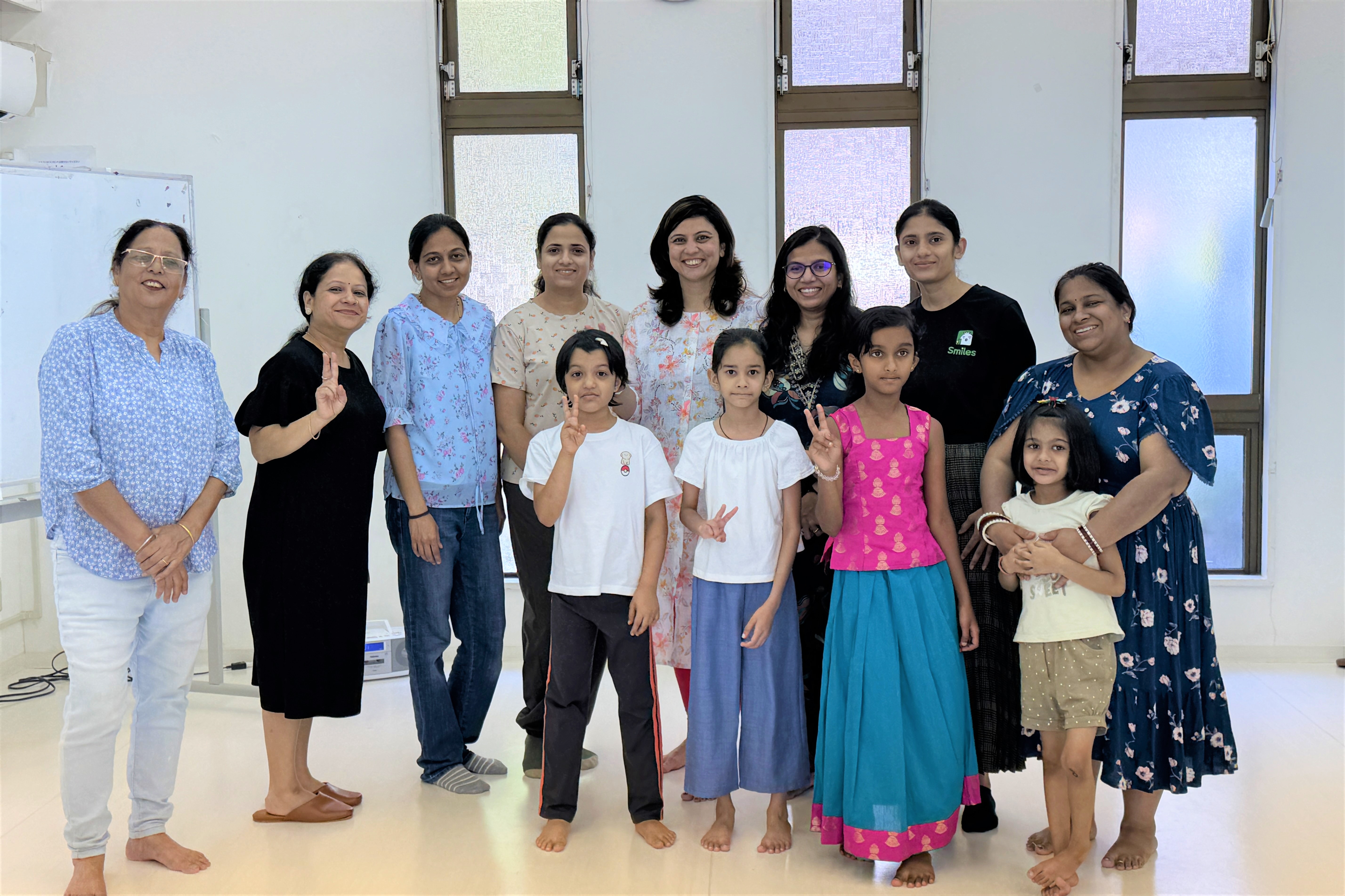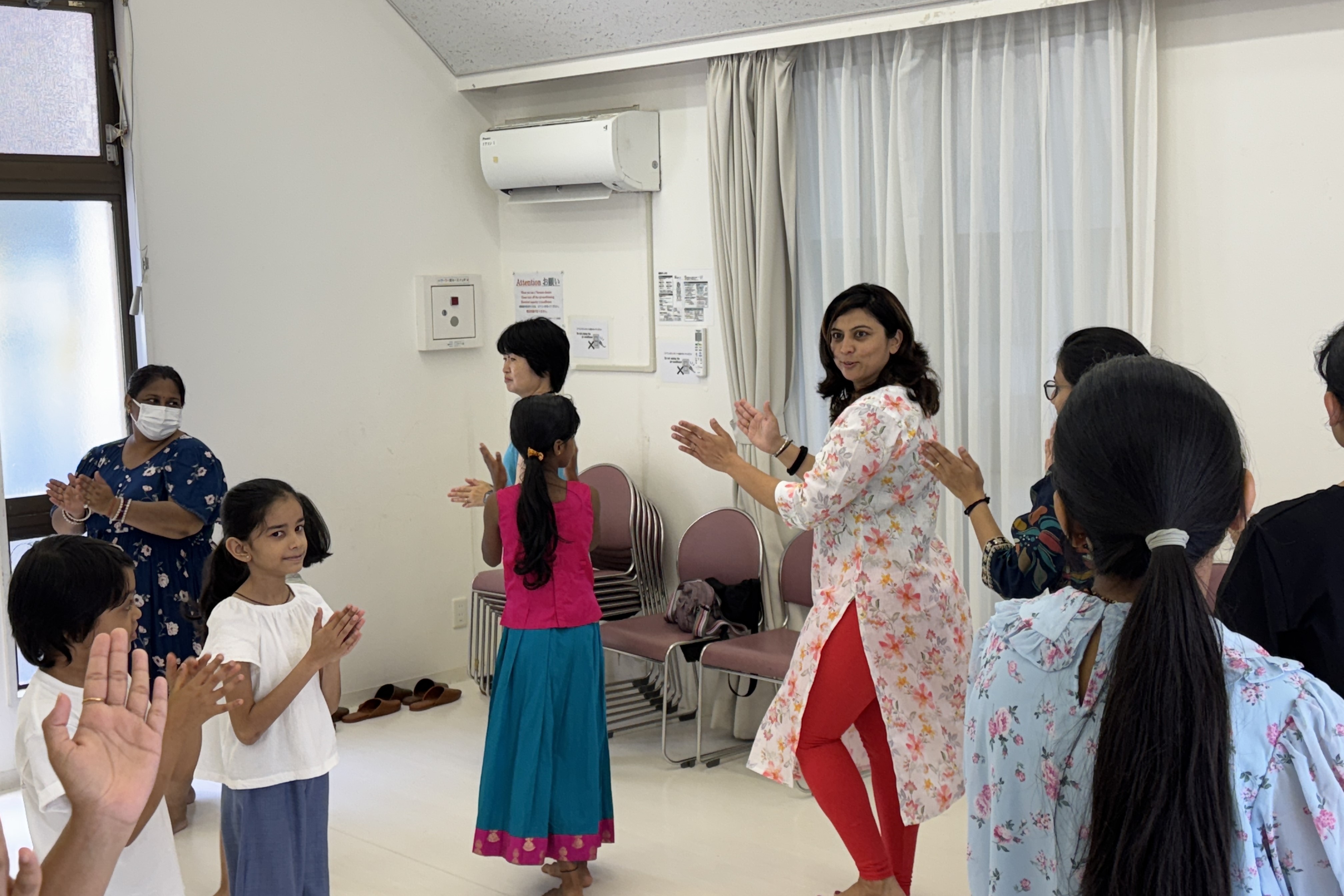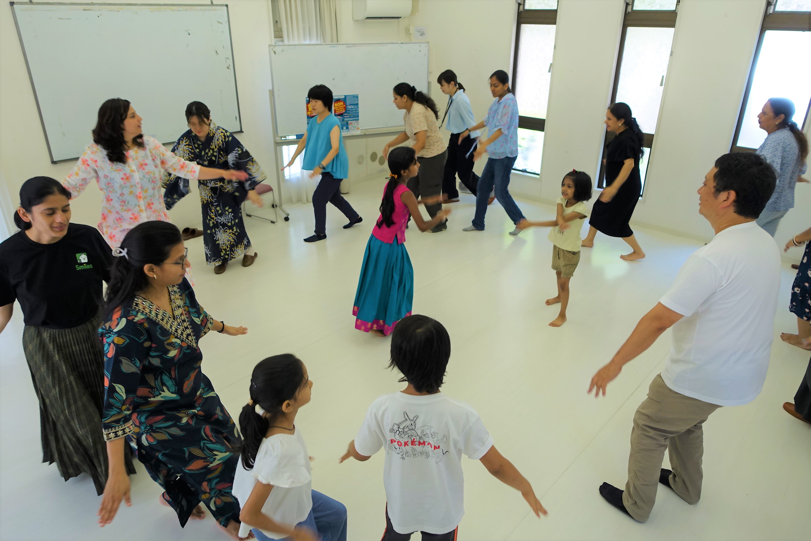 振り付けは近隣にお住まいの方からレクチャーしてもらい、日本の方だけでなくインドの方も合わせて、総勢19人が参加しました。最初は戸惑っていた参加者も次第にコツをつかみ、終盤には、自然に踊ることができるようになっていました。