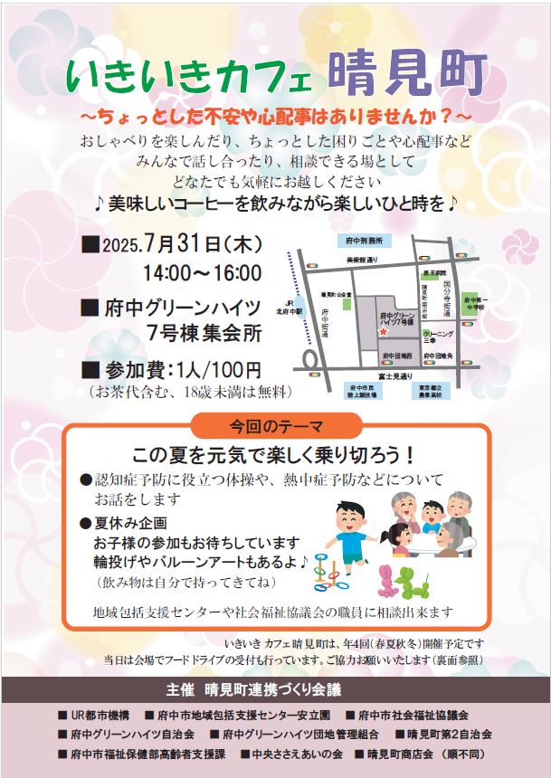 7月31日(木)、府中グリーンハイツ(東京都府中市)の集会所で、4月に引き続き2回目となる「いきいきカフェ晴見町」を開催しました。