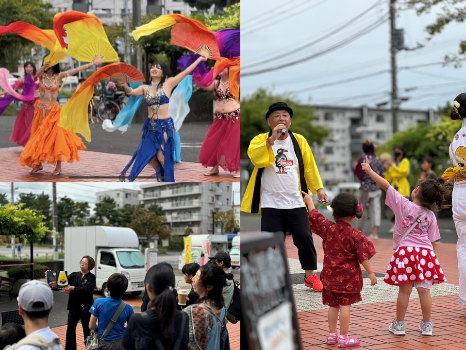 地域の楽しい&おいしいが集結!天候に恵まれ、900人を超える多くの方に来場いただきました!スーパーボールすくいはこどもに大人気。卓球バレー、輪投げやミニフリーマーケットは幅広い世代の方の楽しむ姿が見られました。特設イベント広場では、絵本の朗読、盆踊りやベリーダンスのパフォーマンスが行われ、とても盛り上がりました。