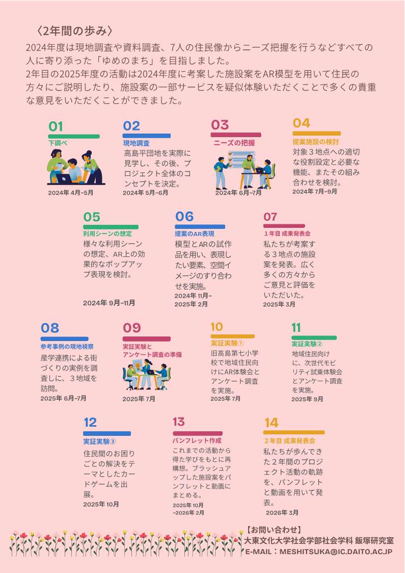 高島平団地(東京都板橋区)を舞台に大東文化大学、トヨタモビリティ東京株式会社、板橋区、URが団地の未来の在り方を考える「高島平ゆめのまち産学官連携プロジェクト」を展開。令和6年度より、団地内の3地点を題材に、地域の課題に寄り添った有効活用案を学生の視点で構想し、産・学・官のワークショップを通じて検討を重ねてきました。