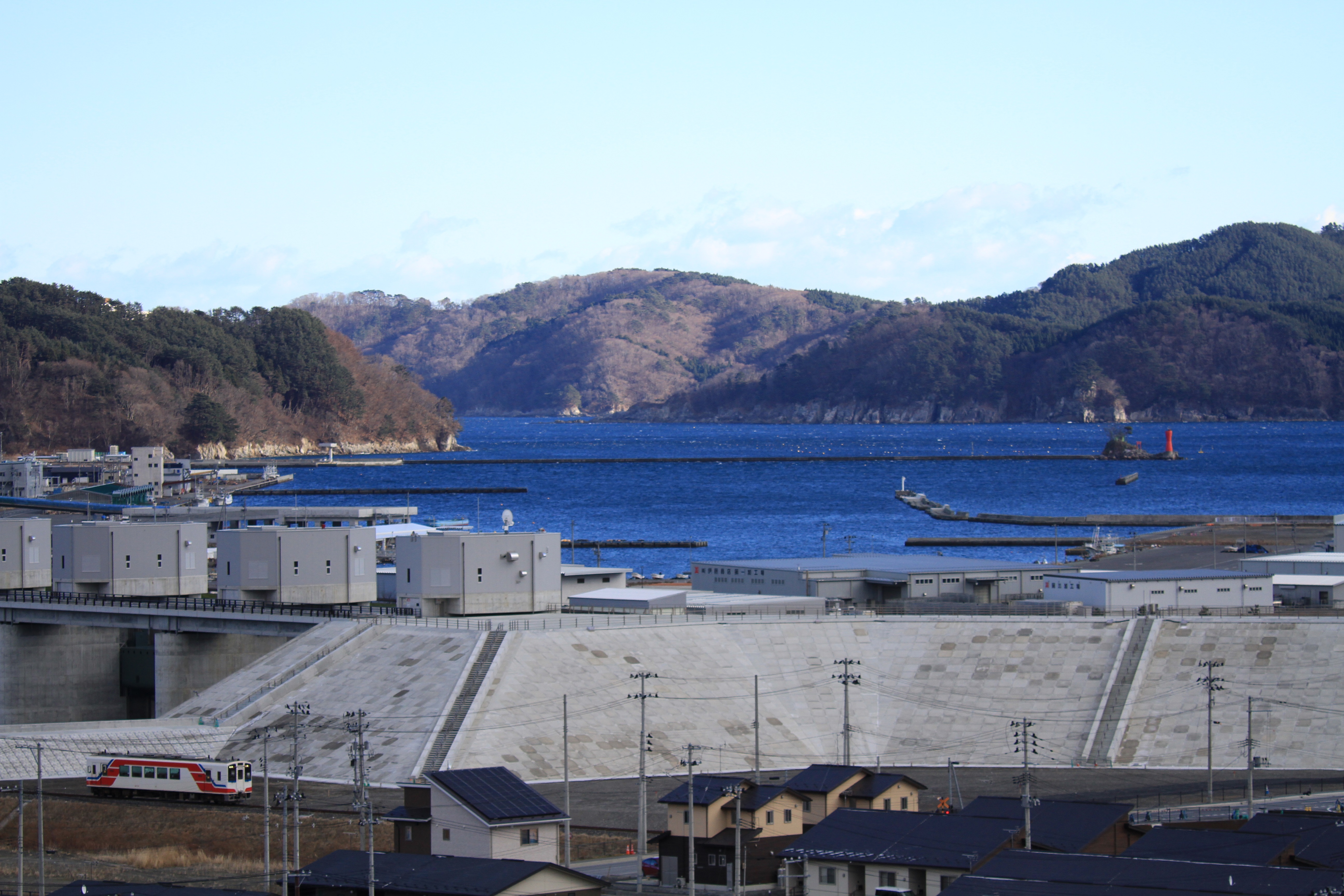 福島県いわき市豊間地区 北側平場岩手県と宮城県の違いの一番の特徴は、津波防災の整備方針において大きく違いました。具体的には、河川護岸の考え方が異なっていることです。岩手県は防潮堤を整備したうえで、河口は、水門により津波の遡上を防ぐという考え方をとっておりました。したがって、河川堤防の嵩上げは行わず、市街地の盛土をあまりしていないことが市街地の復興のスピードに大きく寄与した反面、岩手県の復興市街地は海がほとんど見えない状況となっています。