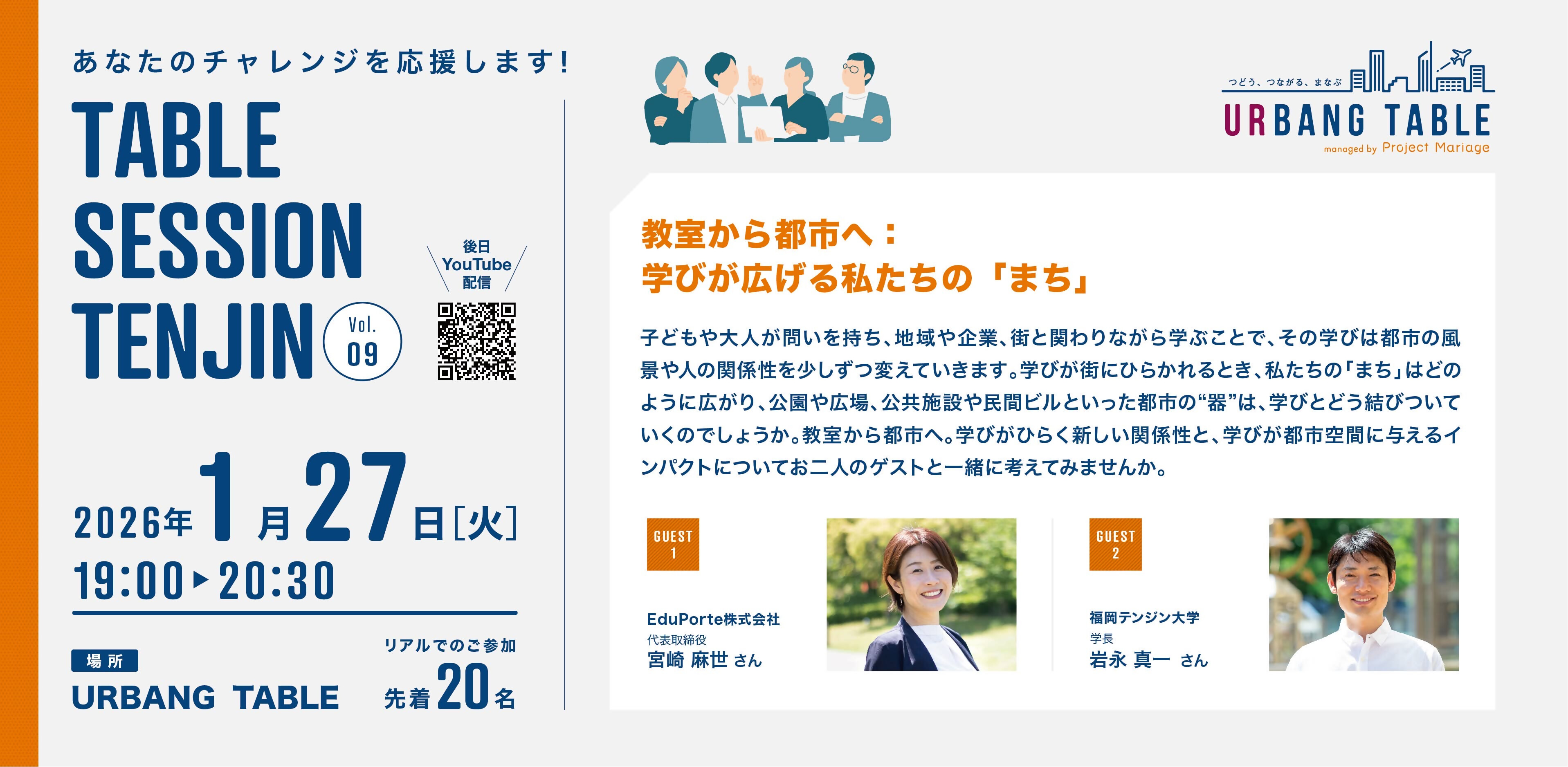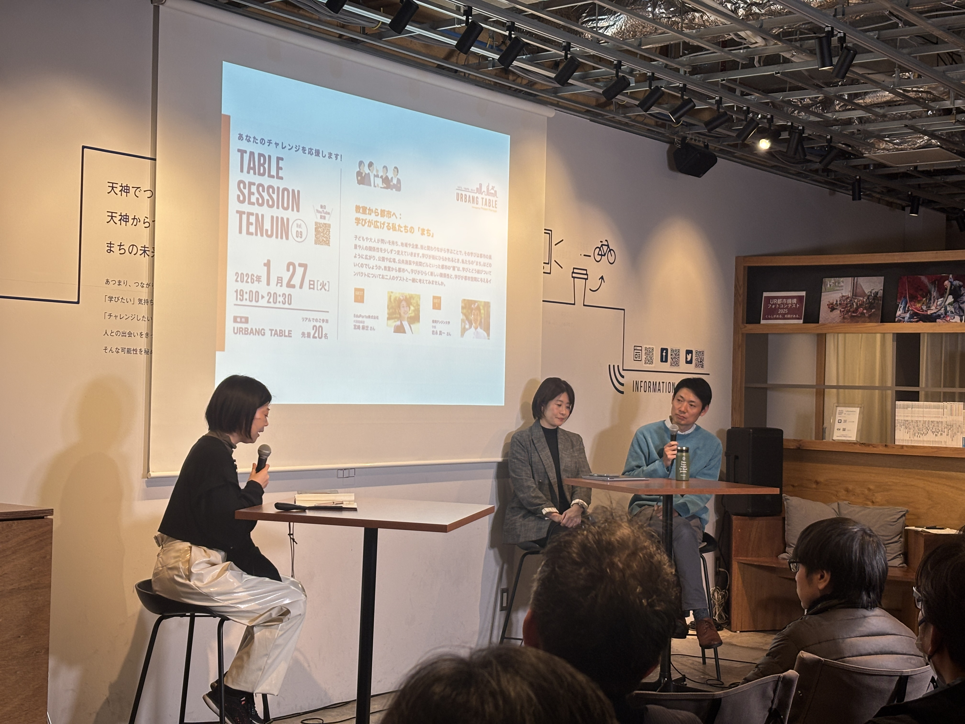 1月27日(火)、URBANG TABLE(福岡市中央区天神)で、EduPorte株式会社の宮崎麻世さんと福岡テンジン大学の岩永真一さんをお招きし、「教室から都市へ:学びが広げる私たちのまち」をテーマにトークイベントを開催しました。