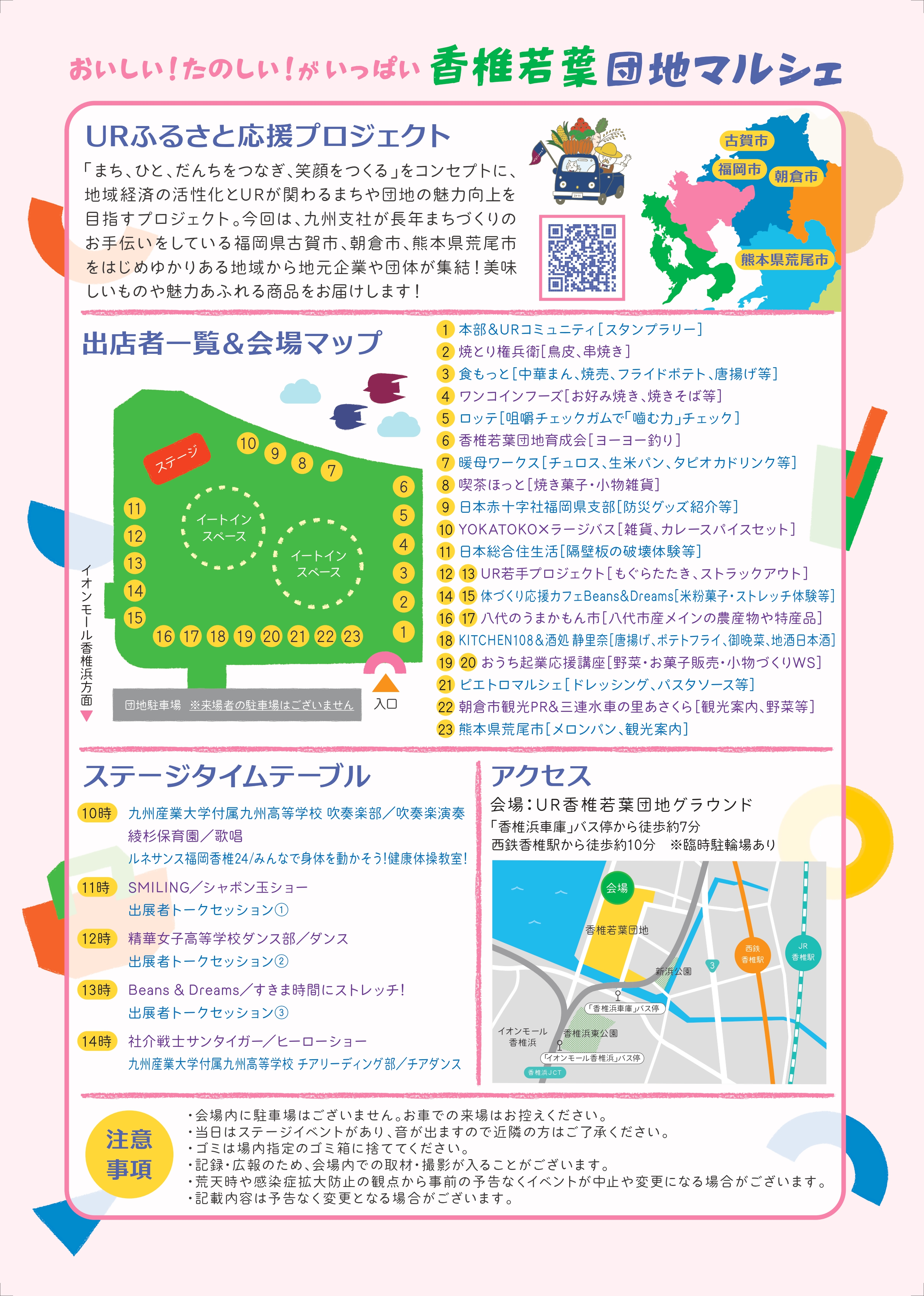 地域経済の活性化とまちや団地の魅力向上を目的に地域の特産品などの販売や観光PRなどを行うURふるさと応援プロジェクトの一環として、UR九州支社がまちづくりのお手伝いをしている地域に加え地元企業や団体が集結。