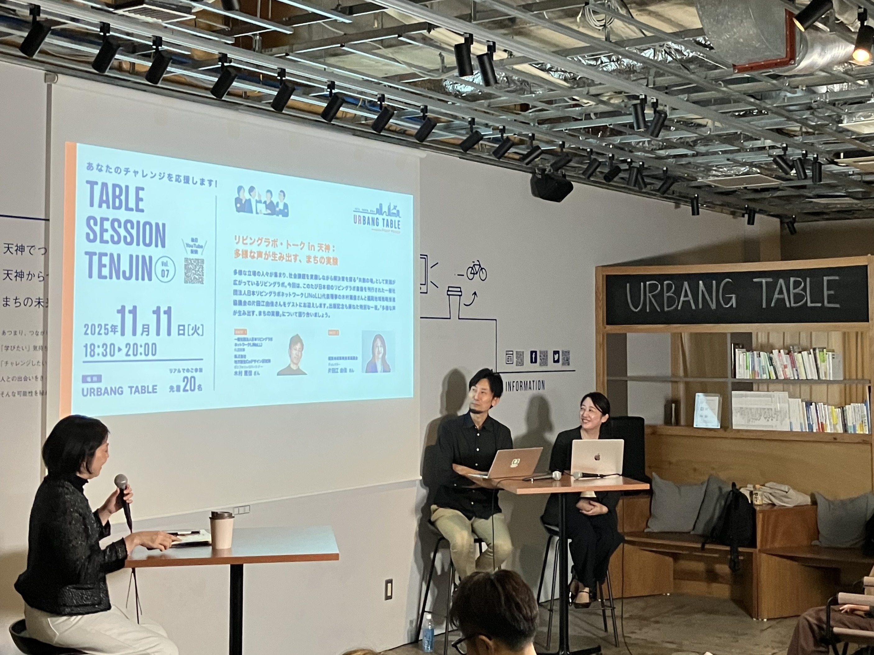 11月11日(火)、URBANG TABLE(福岡市中央区天神)で、ゲストに一般社団法人日本リビングラボネットワーク(JNoLL)の木村篤信氏と福岡地域戦略推進協議会の片田江由佳氏をお招きし、「リビングラボ・トークin天神:多様な声が生み出す、まちの実験」をテーマにトークイベントを開催しました。