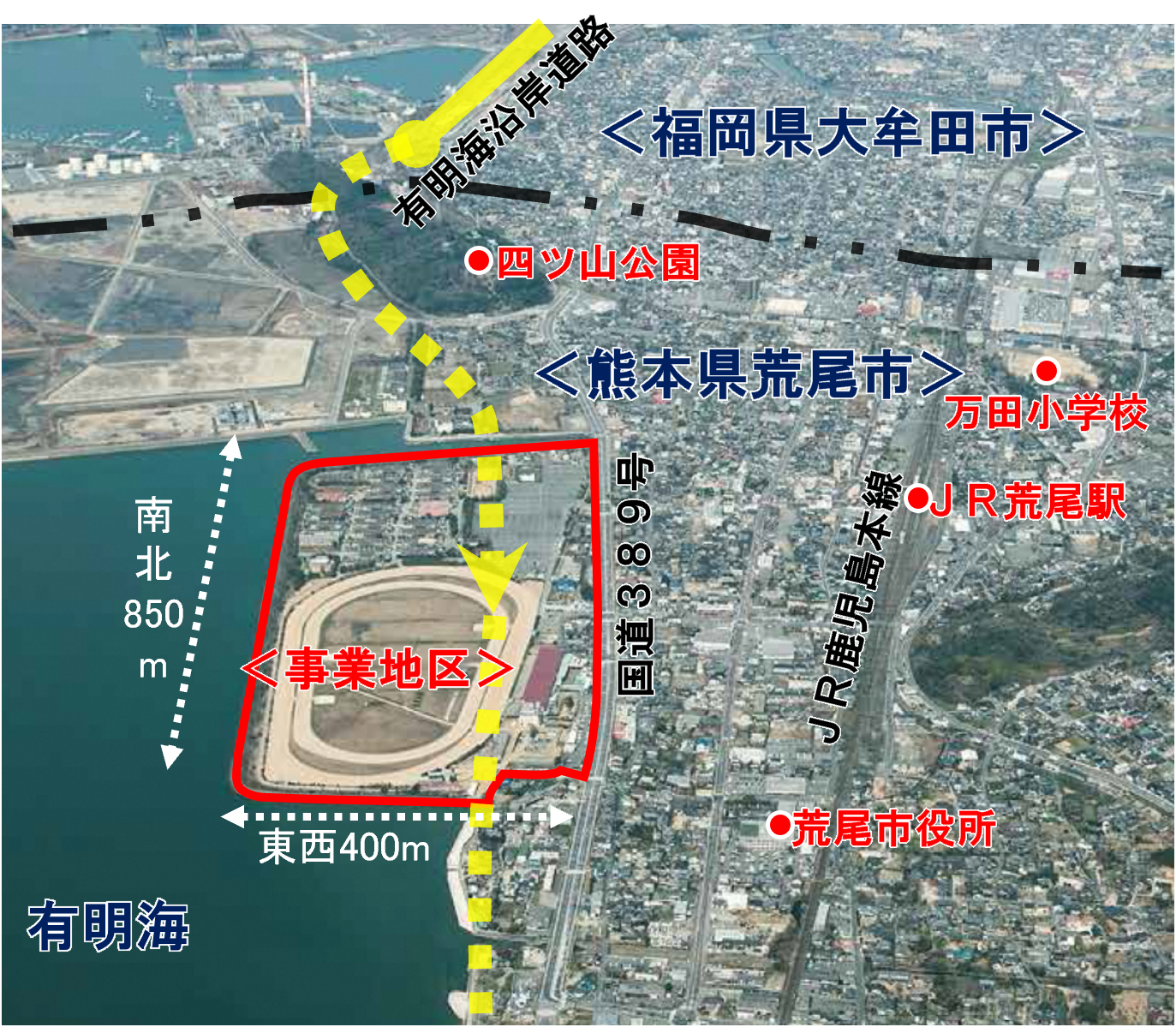荒尾市は熊本県の最北端に位置する有明海に面した人口約5万人の都市です。当地区は荒尾市の北西部に位置し、旧荒尾競馬場の跡地と既存住宅地等を含む面積約35haの地区です。
