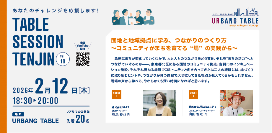 URBANG TABLEでは「まちづくりは人のつながりづくり」をコンセプトに毎月1回トークイベントを開催しています。現在は、天神のことを内の目と外の目で観察するために、天神地区の人とそれ以外のエリアの人の2名で対談形式で実施しています。