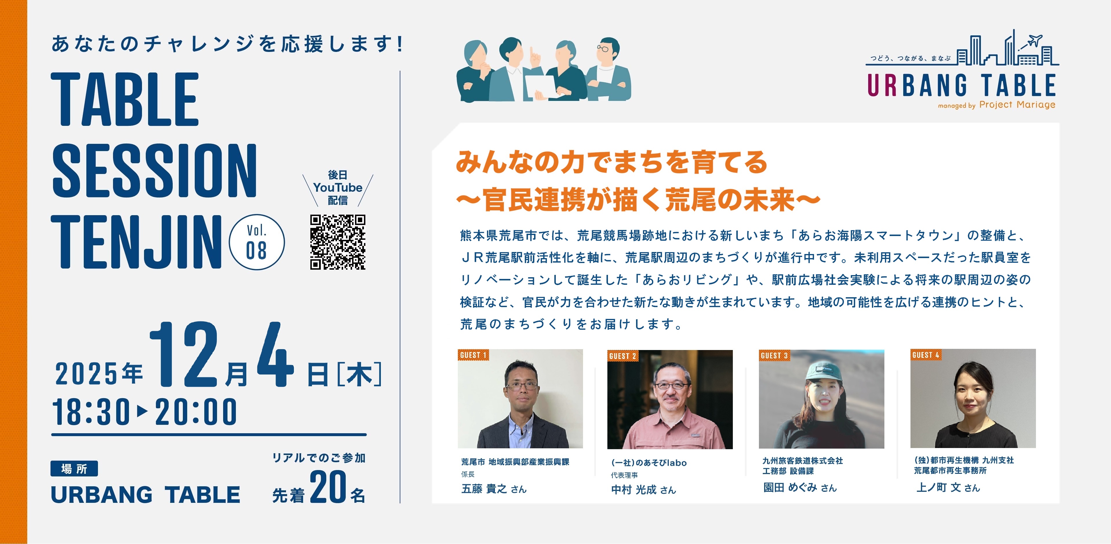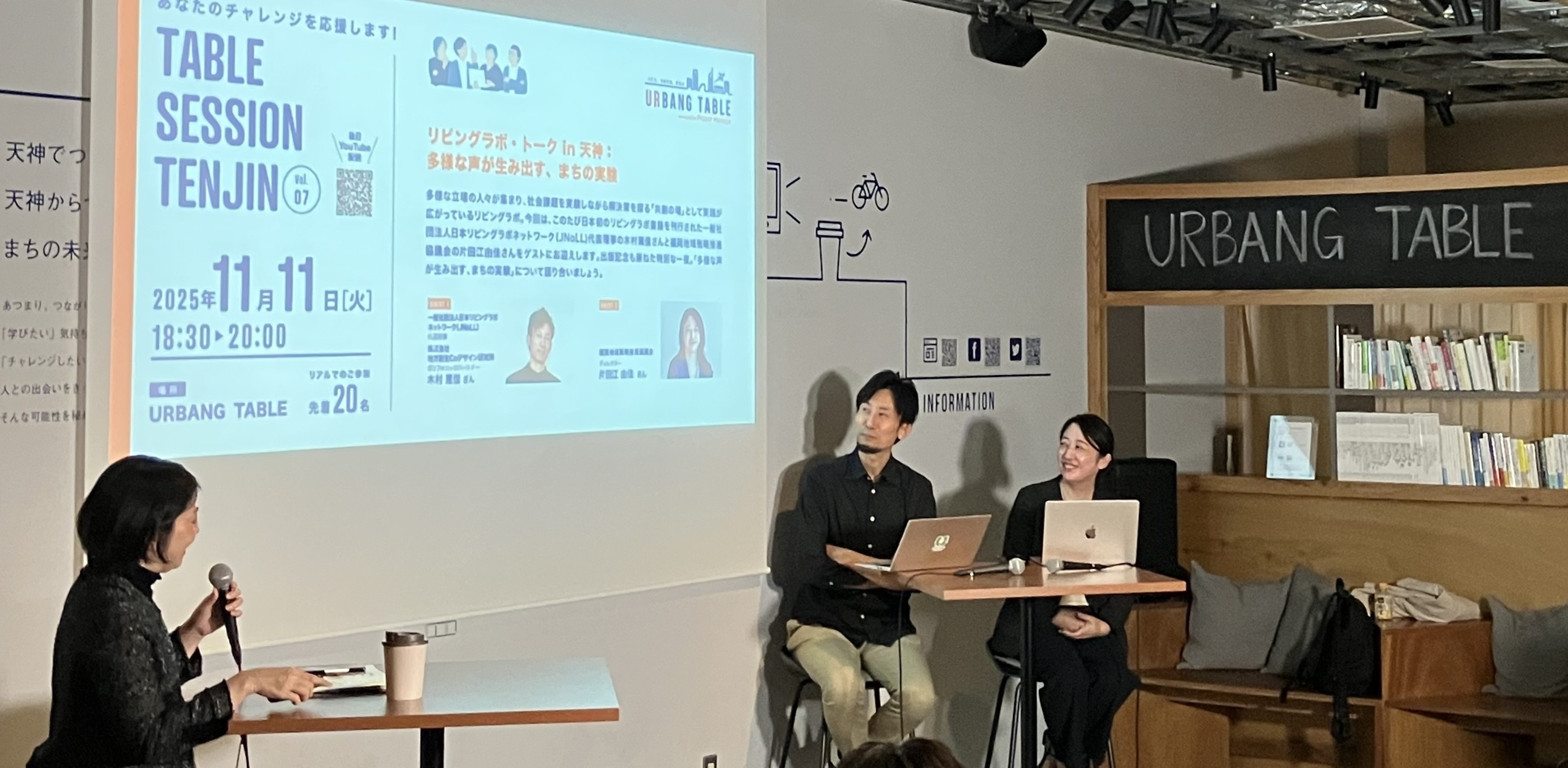 URBANG TABLEでは「まちづくりは人のつながりづくり」をコンセプトに毎月1回トークイベントを開催しています。現在は、天神のことを内の目と外の目で観察するために、天神地区の人とそれ以外のエリアの人の2名で対談形式で実施しています。