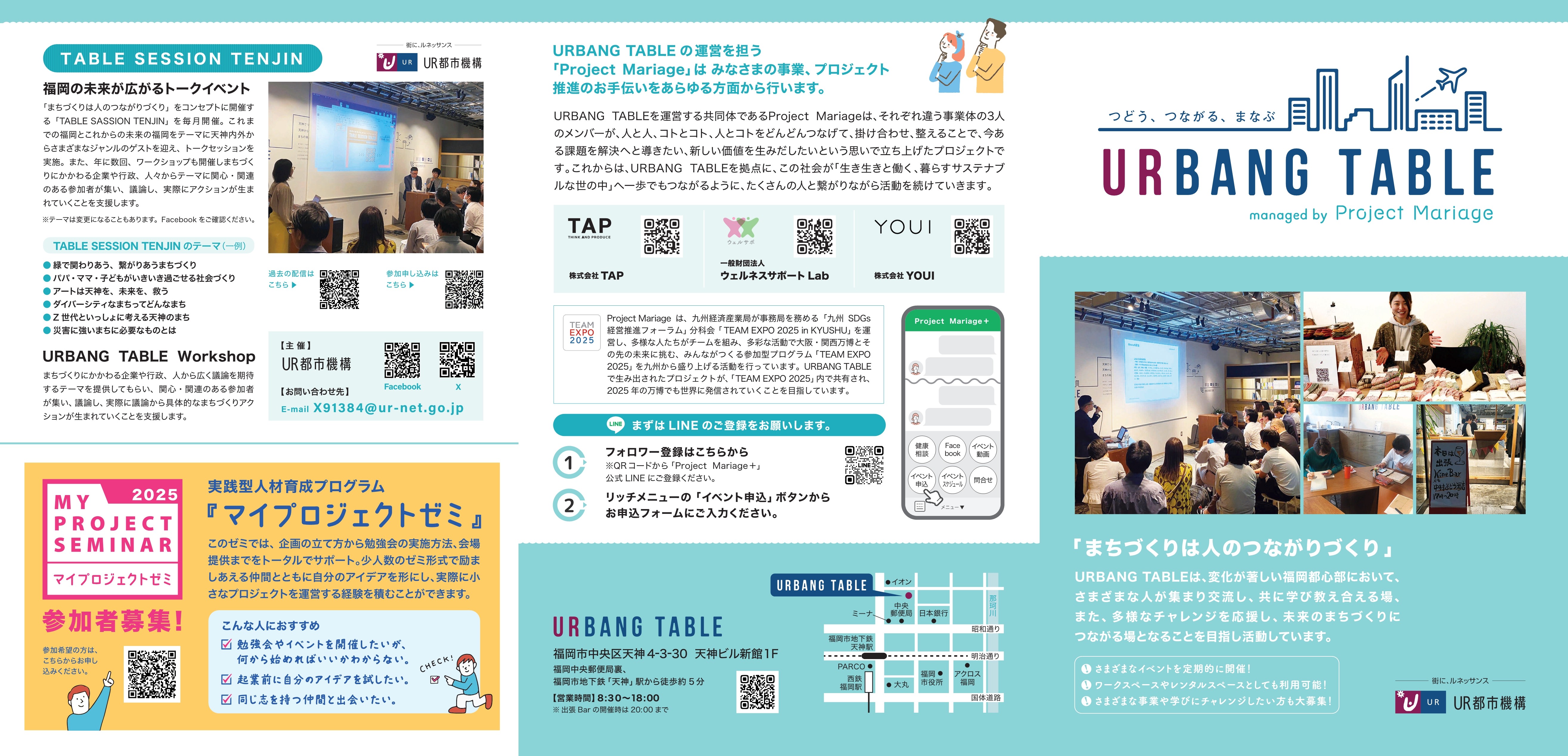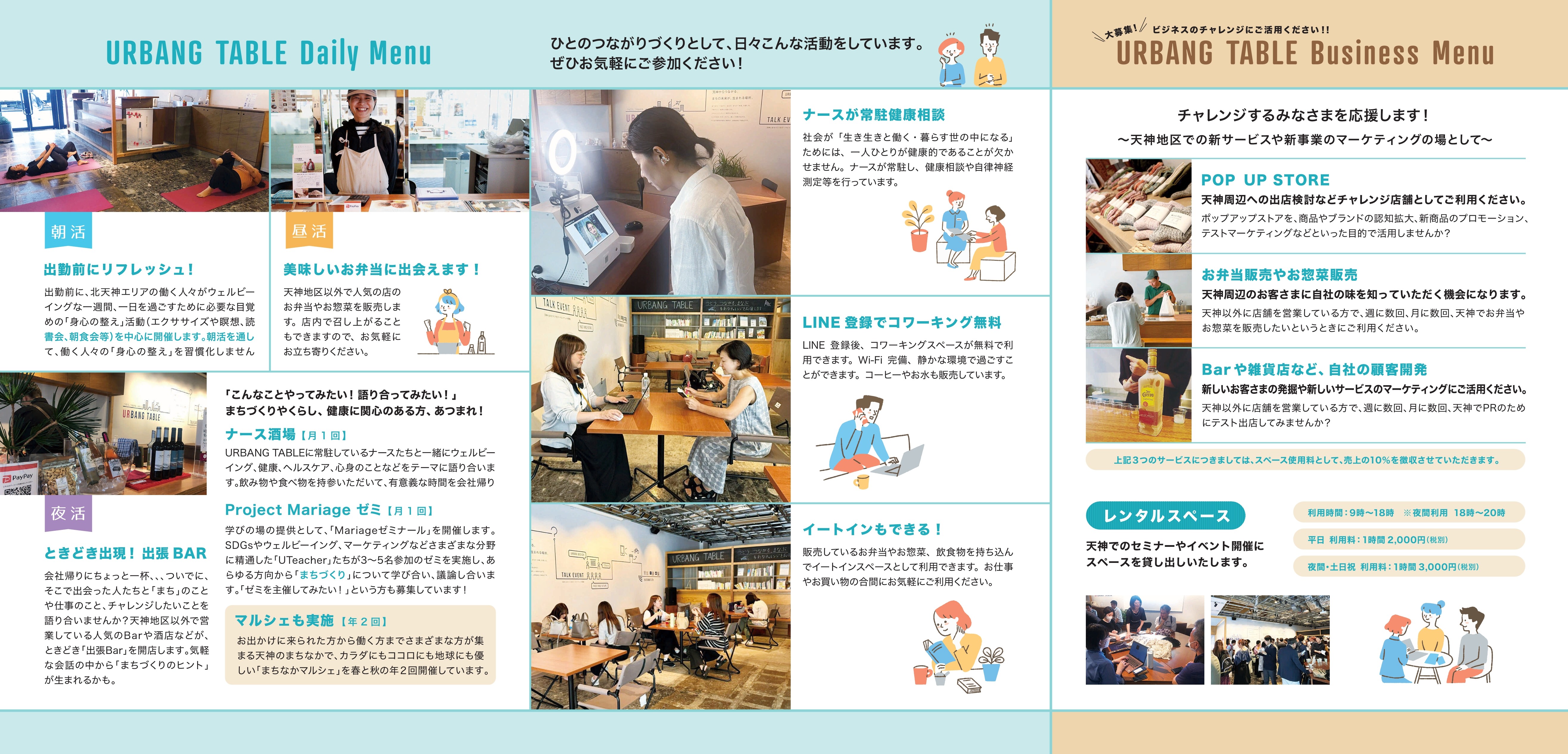 URBANG TABLEは、「まちづくりは人のつながりづくり」をコンセプトに、変化が著しい福岡都心部において、人と人が交流し、共に学び教え合い、チャレンジを応援し、未来のまちづくりにつながる場になることを目指しています。