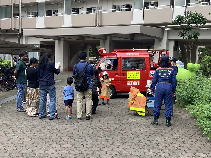URの会場では江戸川区作成の災害・緊急時の多言語情報ツールの紹介や防災に関するゲームを行いました。団地内通路では、一般社団法人SSKによるみちあそびを実施しました。共催の東京都住宅供給公社(JKK東京)会場では初期消火や起震車などの防災体験や防災講座などが行われました。