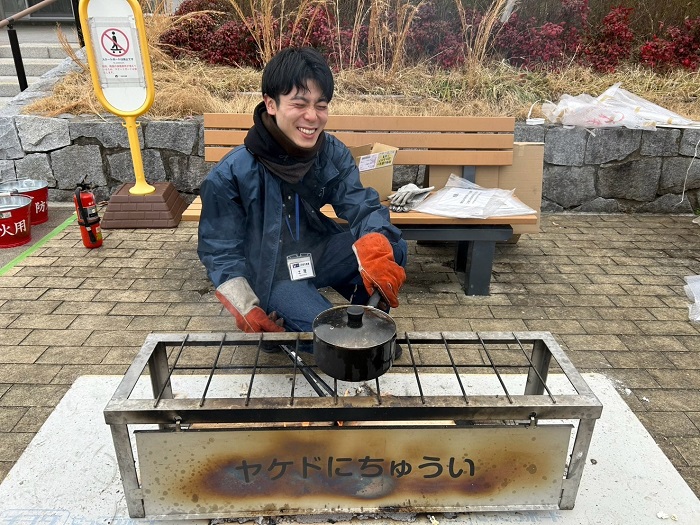 かまどベンチで防災食アルファ米やポップコーン作り。好評で長蛇の列ができていました -