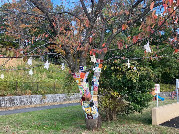 ※ 家で余った毛糸を編んで持ち寄り、継ぎ合わせて木などを飾り付けるストリートアート