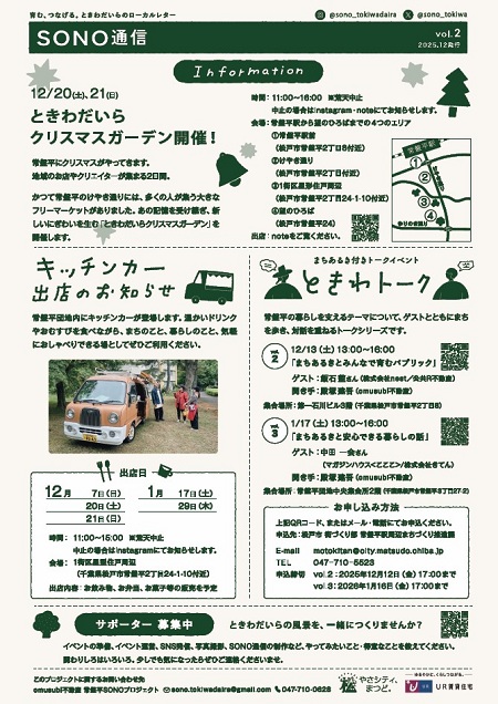 常盤平団地エリア(千葉県松戸市)で「ときわだいらクリスマスガーデン」を松戸市とURが共催します。このイベントは、市と連携した「常盤平SONOプロジェクト」の一環として、常盤平駅前から望のひろばに4つの会場を設け、さまざまなコンテンツを展開します。40以上の地域のお店が出店するなど、このまちだからこそできるにぎわいを、ぎゅっと詰め込んだ2日間。イベントを巡りながら、このまちで一緒に楽しみませんか。
