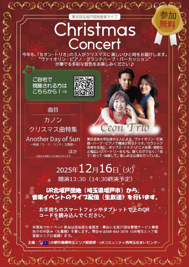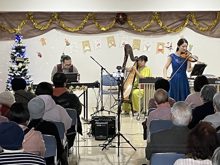 北坂戸団地(埼玉県坂戸市)で8回目となる音楽ライブを開催します。恒例となったクリスマスコンサートで「セオン・トリオ」が素敵な演奏を披露します。