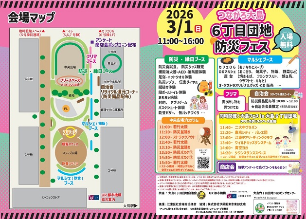 3月1日(日)、大島六丁目団地(東京都江東区)で、大島6丁目団地自治会・大島六丁目団地ショッピングセンター・URが「つながろ大島 6丁目団地防災フェス」を開催します。