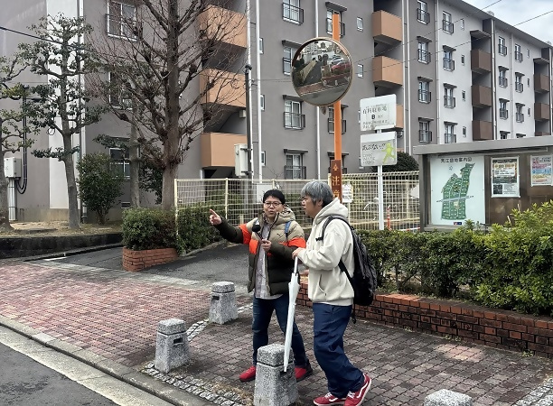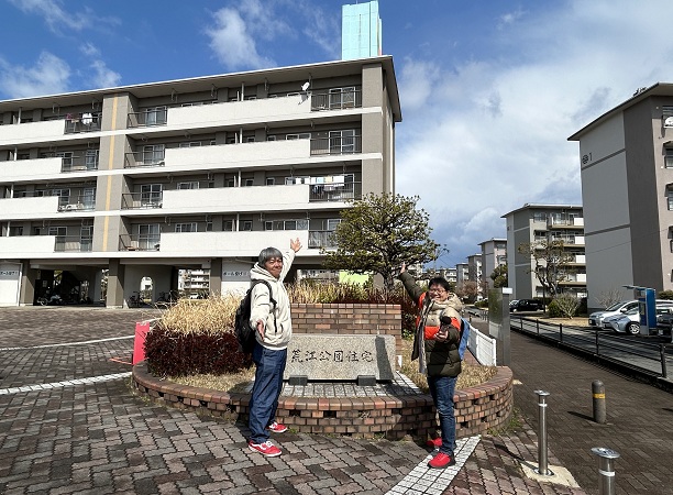 記念すべき初回の収録で荒江団地(福岡市城南区)を訪れた有馬ディレクター(左)と宮本アナウンサー -