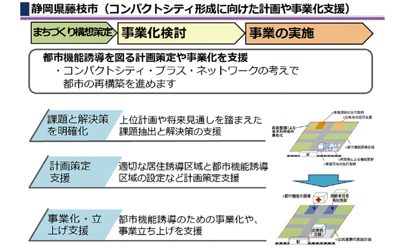 さらに、「災害復興支援」や「まちづくりの相談・コーディネート」「コンパクトシティ形成に向けた計画や事業化支援」「土地区画整理の技術支援、子育て・商業・居住機能」について実例と併せて紹介しました。