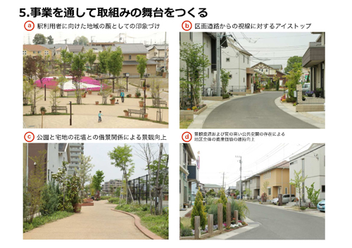 - 先ほどお話しした、資産価値が経年劣化とともに下落していく、負の循環からプラスの循環に転じていくようなアクションというものを、まちが完成した後、まち開き後に本当に有効に機能させていくためには、事業によって、まちをつくる段階、道路の形や宅地の配置の仕方、そういったところでも留意しなければいけないことがあるのだろうと我々は考えました。