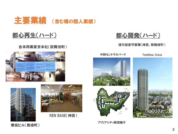 - パートナーの神河は、こてこてのデベロッパー畑を歩んできており、森ビルでは、最年少で開発プロジェクトマネージャーに任命され、六本木ヒルズの運営、立ち上げを行い、現場で陣頭指揮をとっていた人物で、その後は上場のデベロッパー会社に入り事業開発部門の開発・経営等を実施していました。