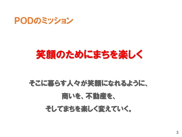 - では、簡単に自己紹介をさせていただきます。業務領域ですが、私どもの会社は、「まち」・「不動産」・「商い」、単体での仕事だけでなく、これらの領域が重なった部分もやらせていただいています。PODという会社は、2人で立ち上げた会社です。立ち上げたのは2010年の3月。今年でまる7年を過ぎて8年目に入ります。